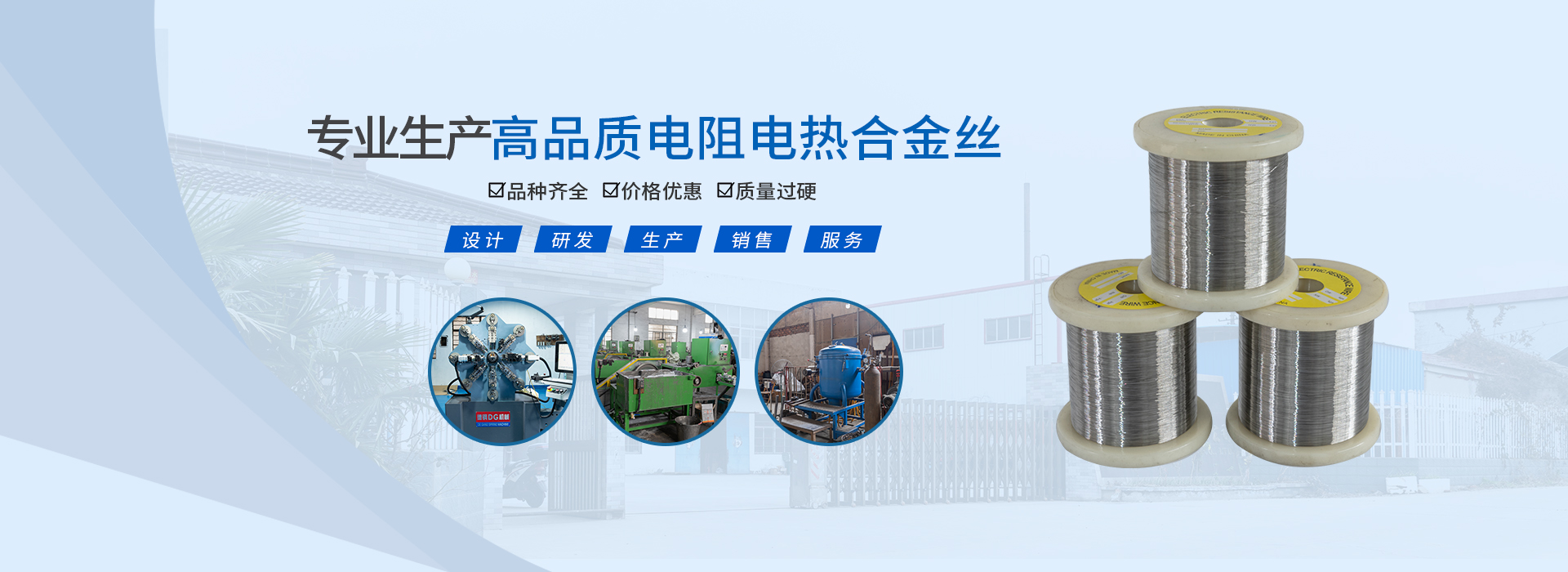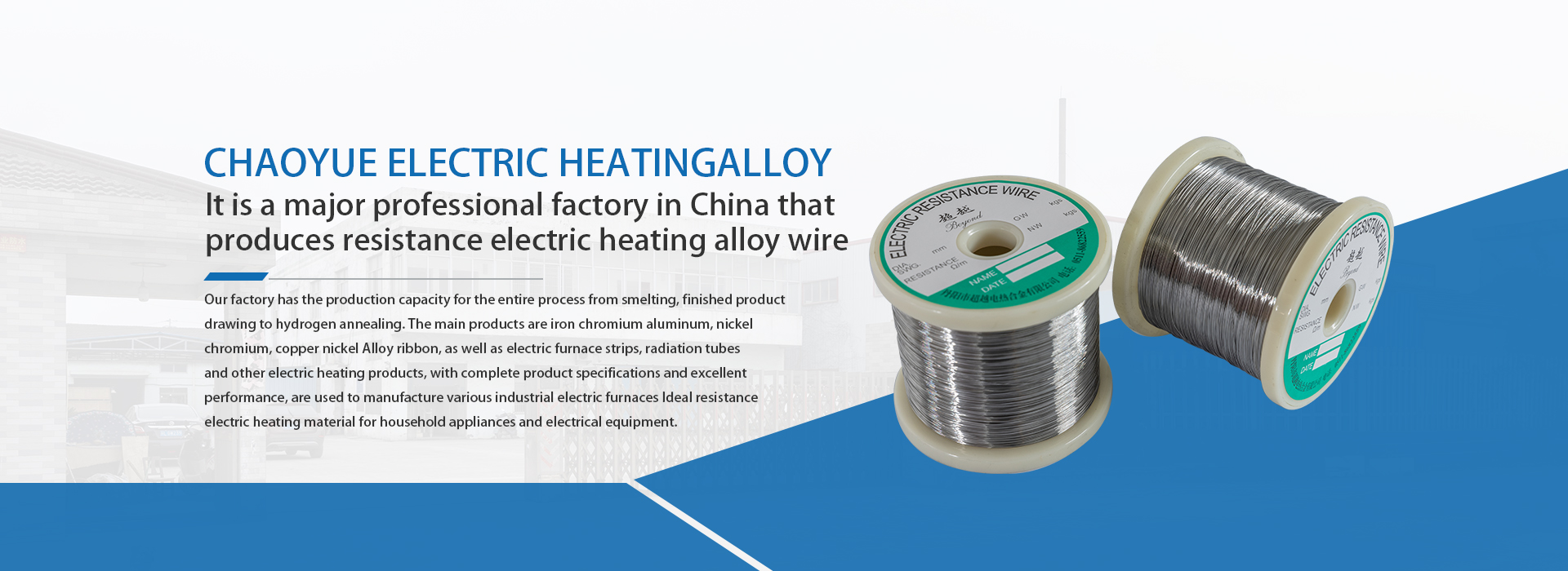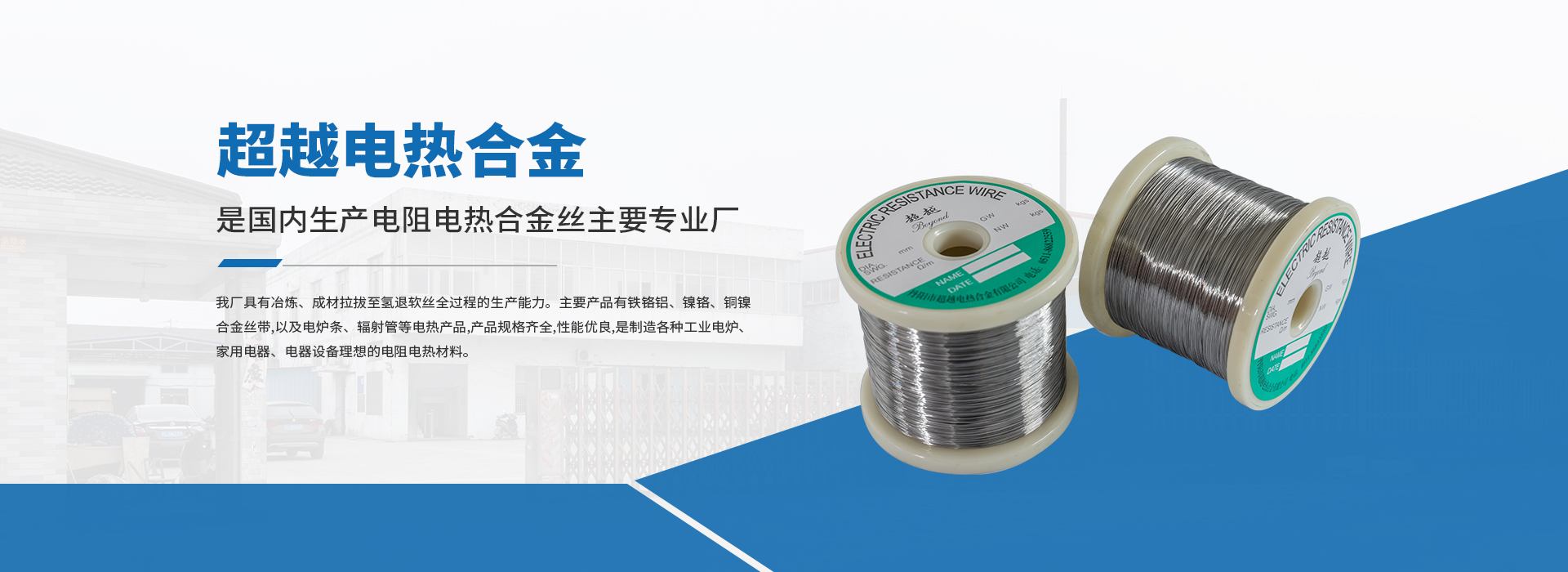 丹阳市超越电热合金有限公司地处长江三角洲之畔的吕城镇,是沪宁铁路复线上的重镇,是国内生产电阻电热合金丝主要专业厂。我厂具有冶炼、成材拉拔至氢退软丝全过程的生产能力。主要产品有铁铬铝、镍铬、铜镍合金丝带,以及电炉条、辐射管等电热产品,产品规格齐全,性能优良,是制造各种工业电炉、家用电器、电器设备理想的电阻电热材料。参照国际要求标准,严格执行国家标准,不断采用新技术,新工艺,使我们的产品精益求精,严格···